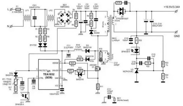 以NXP的TEA1832圖紙做說明。分析電路參數設計與優化并到認證至量產。所有元器件盡量選擇電源適配器公司現有的或者量大的元件,方便后續降成本。