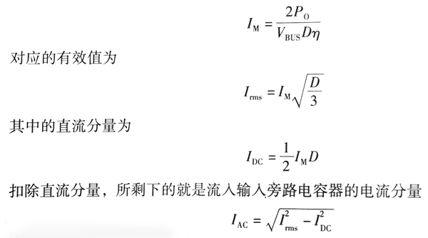 5.3.5整流濾波電容器的真實選擇 1.承擔整流濾波和旁路的電容器選擇 對于承擔整流濾波和旁路功能的電容器來說,需要相對很大的電容量,因此電解電容器成為“”的選擇?在實際應用中,電解電容器的承載電流能力比較低,在實際應用中近根據整流濾波電容器的較低電容量選擇依據選擇的電容量,電容器將不能承受電路整流電路和反激式變換器所產生的交流電流分量。 85-265V國際通用電壓等級交流電輸入狀態下,整流濾波電容器承受約27mA/W的紋波電流有效值。 220V交流電壓等級在較低輸入電壓狀態下,整流濾波電容器承受約13.3mA/W的紋波電流有效值。 因此,在大多數的應用中電源適配器中的濾波用電解電容器的選擇需要根據電解電容器可以承受的電流選擇。 例如輸出功率為24W的反激式電源適配器,如果輸入電壓為85~265V國際通用電壓等 級,則整流濾波電容器將承受約0.65A有效值電流,至少需要選擇100μF/400V的電解電容器,通常100μF/400V的電解電容器可以承受0.5~0.7A有效值電流,這個電容器也超過了72uF的較低電容量。 如果同樣的24W的反激式電源適配器,采用220V電壓等級交流電供電,則整流濾波電容器流過的紋波電流為0.32~0.33A,33μF/400V電解電容器時可以承受這個幅值的是有效電流的。 由于電解電容器的可承受紋波電流能力并不是隨電容量線性增長的,因此隨著電源適配器輸出功率的增大,隨需要的電容量將更大。 如輸出功率為100w的反激式電源適配器,在85~265V國際通用電壓等級供電條件下,整流濾波電容器將承受2.7A有效值電流,220μF/400V的電解電容器較大電流承受能力( chemi-con公司的SMQ系列85℃/2000小時型)較大不過1.4A,即便是470μF/400V的電解電容器的承受電流能力也不過2.39A,需要選用560μF/400v的電解電容器(2.69A)。 如果選用220V電源電壓等級供電,則電容量可以減小到220μF/400V。 如果不是高紋波電流產品,則需要按電解電容器實際可以承受的有效值電流選擇電容量。 2. 僅承擔旁路功能的電容器選擇 直流供電的反激式電源適配器的電容器選型首先要滿足紋波電流的條件,然后再考慮電容量對濾除電源紋波電壓的影響。 紋波電流的考慮需要記住以下公式: 反激式變換器想直流供電電源索取的電流峰值為