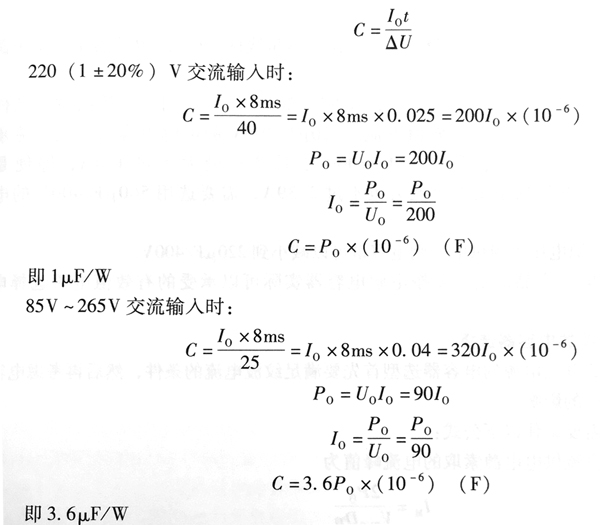 每半個電源周波(10ms),整流器導電時間約3ms,其余7ms為濾波電容器放電時間,承擔向負載提供全部電流,則:濾波電容器容量為0.88μF/W和3.15μF/W。