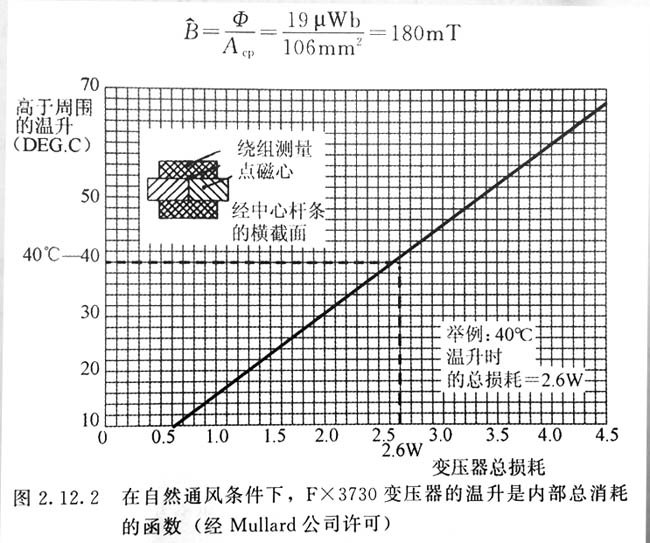 優化磁通密度 較優磁通密度Bopt的選擇需要仔細考慮。不像反激變換器,該電路要使用兩個象限的B/H回環,可得到的磁感偏移大于反激時的兩倍。因此應該更加小心考慮磁心損耗,因為如果使用整個磁感偏移,磁心損耗可能超過銅損耗。對于較有效率的設計,磁心損耗和銅損耗應接近相等。 圖表示了41mm磁心以變壓器總損耗為變量的溫升曲線。假設允許的溫升是40℃,則變壓器中允許的功率損耗是2。6W(注意熱點溫度稍高于整個磁心溫度平均值)。因此如果該功率損耗由磁心和繞組平均分擔,則較大的磁心損耗是1.3W。 由圖可以看出在30kHz時,FX3730磁心在總磁通Φ接近19μWb時的損耗是1.3W。中心磁極的面積是106mm2,故中心磁極中的峰值磁通密度B是