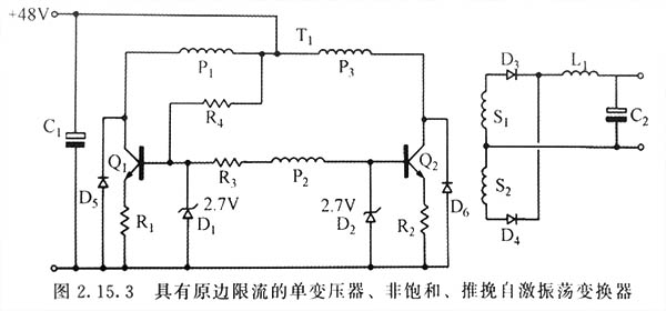 合理選擇R1的值,使集電極電流達到較大控制值時切斷驅動電流,此時磁心正好進入飽和點,即圖中的點S1’。由于達到鉗位電流時H不能夠進一步增加,所以所有繞組兩端的電壓必須下降到零,后面只需要非常小的反激作用使Q1關斷和Q2導通Q2繼續完成工作周期。集電極限制電流不再取決于晶體管增益。