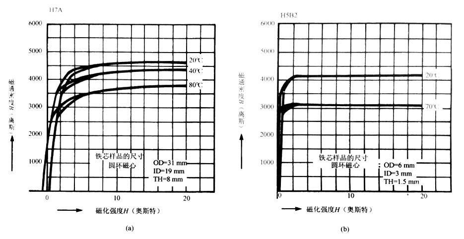 對于一些矩形磁滯回環材料,飽和后導磁率(飽和區B/H特性的斜率)非常低(B高)。圖中表示的是H5B2材料的特性。因此,S1與S2之間的磁通密度變化非常小,關斷時的反激作用較弱,使轉換期間開關作用緩慢。在所示的圖中可以看出H7A或類似磁心材料具有更有力的開關作用,但由于這些材料具有低的Br(剩磁)值,磁心損耗常常較高。