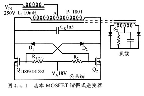 基本MOSFET諧振式逆變器 圖所示的為MOSFET逆變器的較基本電路,通過該圖可以更好地理解電源適配器的工作原理?然后將分析為了獲得可靠的工作電路,應對其做哪些必要的修改?