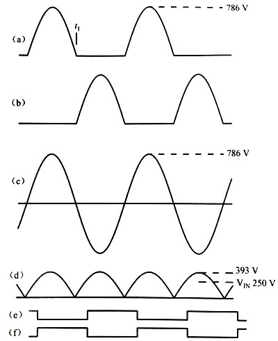 在圖所示的復讀機電源適配器基本電路中,柵極驅動電路與雙穩態多諧振蕩器十分相像?電源適配器電路一旦啟動,就可以在穩態條件下運行良好,無需做任何修改?然而,稍后就可以發現,有個問題使電路不能可靠啟動,為了解決這一問題,應做如下的修改? 考慮以下啟動條件:輔助電壓VA已經建立,輸入電壓VN也已經施加,且電路已經運行于穩態?(本例中相對于公共端,VA為18VDC,VN為250VDC?) 在這種條件下,并聯諧振電容CR和原邊P1兩端的電壓為正弦波,如圖所示P1中心抽頭A點的電壓為全波整流后的正弦電壓(或選加正弦波,如圖4?4?2d所示)由于L1的輸入端接至直流電壓(Vw),L兩端的電壓為類似的帶有直流偏置的選加正弦波?注意圖4?2?2中除P1電壓以外,電壓的參考點均為公共端? 為了使輸入電壓的紋波較小,扼流圈L1的電感值相當大(本例中為10mH),電流中的直流分量相對于交流紋波電流來說很大,因此扼流圈的電流近似恒定?A點的選加正弦波電壓由L1的工作狀態以及由變壓器原邊電感和C構成的諧振電路完全決定?