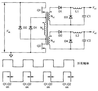 | 基本原理 電源適配器雙端正激變換器拓撲如圖所示的單管單端(以下簡稱單端)正激變換器使用單個開關管不同,雙端正激變換器使用兩個開關管,且這樣有顯著的優點。即關斷時,每個開關管僅承受一倍直流輸入電壓(單端正激變換器中為兩倍直流輸入電壓)。另外,關斷時也不出現漏感尖峰。 曾指出,考慮到15%的瞬態誤差、0%的穩態誤差和30%的漏感尖峰,交流輸入為額定電壓120V的單端正激變換器的關斷電壓應力高達550V。 盡管許多雙極型晶體管額定V。高達650V甚至850V,能夠承受這樣的電壓應力,但使用只承受一半關斷電壓應力的雙端正激變換器要更可靠。可靠性是開關電源適配器設計中重要的考慮因素。若權衡可靠性與原始成本,則較好的、從長遠看也是較經濟的選擇是可靠性。 而且,對于用于歐洲市場的電源適配器(那里交流電壓為220V,整流后額定直流電壓約為308V),根本不能使用單端正激變換器,因為開關管關斷時電壓應力太大。用于歐洲市場的產品,只能采用雙端正激變換器、半橋或全橋電路。 下面來樣定做電源適配器雙端正激變換器的工作原理。如圖所示,Q1和Q2分別串接于變壓器初級的頂端和底端。兩個開關管同時導通和關斷。當它們導通時,所有初級和次級的同名端為正功率傳遞給負載。當它們關斷時,存儲于們勵磁電感上的電流使所有繞組電壓極性反向。Np的同名端電位被二極管D1鉗位至地電位。N的異名端電位被二極管D2鉗位于Vdc。