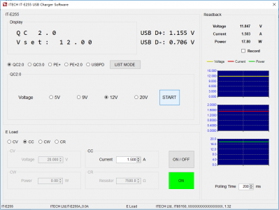 | 今年是USB 充電器爆發的一年。無論是手機、平板、還是筆記本電腦,越來越多的消費類電子產品都不約而同的用上了TYPE-C接口,支持USB PD充電協議。 一款快充充電器好不好,首當其沖的肯定是兼容情況,其次是輸出帶載能力。 較近購買一款小米45W的PD充電器,同時兼容QC2.0、QC3.0快充協議。 市面上多數電子負載并不支持快充協議,而艾德克斯電子新出的IT-E255A快充控制盒卻可以搭配目前多數電子負載進行快充協議的測試。 這個小小的快充控制盒不僅支持QC2.0/QC3.0/PE/PE2.0/USB PD,更重要的是竟然可以和艾德克斯的IT8500+系列的電子負載通信,設定負載的拉載模式和拉載值。 下面就和小伙伴們一起分享小米USB-C充電器的測試。 1.開始準備階段 IT-E255A的輸入口有Mini-USB和TYPE-C 2個接口。 充電器插入口,IT-E255A連上電子負載,測試就可以開始嘍。 1.1 IT-E255A自動進行充電器協議檢測,Type-C輸出口支持USB PD2.0 、QC3.0、QC2.0三種快充協議。 1.2 從IT-E255A顯示屏中可以看出,小米USBPD充電器的快充協議版本為2.0,支持5V/3A、9V/3A、12V/3A、15V/3A、20V/2.25A五個輸出檔位。 1.3 在5V/3A、9V/3A、12V/3A、15V/3A、20V/2.25A五個PD輸出檔位,分別拉載較大的電流,測試其在不同檔位下輸出的電壓和輸出功率。 ![]() 歐規充電器測試接線圖(小米充電器+ 艾德克斯IT-E255A + 艾德克斯IT85150) USB PD 2.O POS1 5V/3A ![]() USB PD 2.O POS2 9V/3A ![]() USB PD 2.O POS3 12V/3A ![]() USB PD 2.O POS4 15V/3A ![]() USB PD 2.O POS5 20V/2.25A ![]() 2.手動按鍵按下“Mode”,選擇QC3.0,點擊“START”,IT-E255A則可誘導小米USB-C充電器從5.0V開始以0.2V的步進值步進,充電器可按照快充控制盒的設定值輸出。 2.1 在QC3.0模式下,誘導充電器輸出6.0V、7.0V、8.0V、9.0V,分別使用電子負載恒流模式拉載,測試其電壓、輸出功率。 ![]() 3. 如果不喜歡手動操作,還可以使用上位機軟件控制。 使用USB數據線將IT-E255A和計算機相連。下載相應免安裝的上位機軟件,打開后就可以使用。 下面做了兩個測試:QC2.0 9.0V輸出: QC2.0 12.0V輸出: ![]() 操作清晰簡易,可以顯示拉載的電壓、電流、功率的波形曲線,自由控制電子負載, 另外還可以設置list自動測試,快速進行判斷、OCP測試等。此外還可以下載到快充控制盒中,與電腦脫機使用,一鍵操作,非常快捷。
