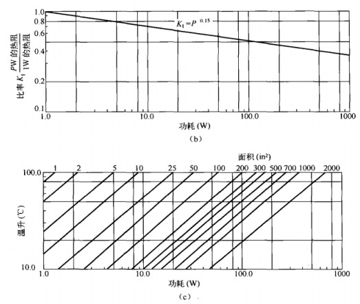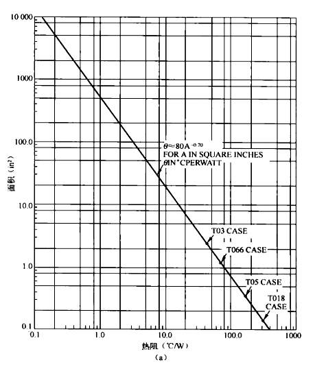 散熱片熱阻與表面積的關系曲線如圖7。4(a)所示,這是一條經驗曲線,是根據大量不同廠家生產的不同尺寸和形狀的散熱片的平均值得來的。圖中曲線對應于1W功率級的熱阻值,在雙對數坐標中表現為一條直線。