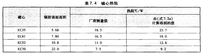 如果有興趣,可以比較一下由廠家提供的磁心熱阻測量值和通過圖7。4(a)計算所得的值(R,=80A,見表7。4)之間的差別。
