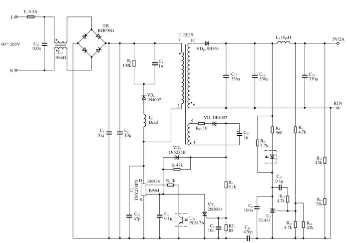 | 本文所討論的低功率電源適配器主要針對輸出功率10瓦的音頻產(chǎn)品充電適配器系統(tǒng)。此適配器設計特點 圖所示電路適用于通用輸入電壓范圍,具有極高的效率,符合適配器CEC能源之星對帶載效率的要求(要求為70.7%,可達到72.5%),空載時低輸入功率(在交流輸入電壓為230V時低于200mW);具有充足的EMI裕量,符合CISPR-22/EN55022B的EMI限制,EMI裕量大于10dBmV;具有增強保護、過壓鎖存保護(OVP)以及過熱鎖存保護(OTP)功能。 2.適配器工作原理 圖所示的反激式電源適配器使用了TNY278PN(U1),在90~265V交流輸入電壓下的輸出為5V/2A。選擇光耦構(gòu)成反饋回路,以實現(xiàn)準確、嚴格的輸出穩(wěn)壓。反饋信號饋入U1的EN/UV引腳。U1通過開關控制來調(diào)節(jié)使能與禁止開關周期的比率,從而達到調(diào)節(jié)輸出電壓的目的,使變換器的效率和負載的關系特性得到優(yōu)化。U1的鎖存關斷特性可以提供輸出過壓保護。一旦因元件故障而造成反饋環(huán)路開環(huán)時,會使輸出電壓升高,從而影響到C20上的偏置繞組的輸出電壓。一旦超過VD9和BP/M引腳電壓的總額定值(約為12.5V),電流便會流入BP/M引腳。當此電流超過6.5mA時,將觸發(fā)鎖存關斷電路。斷開交流輸入后,MOSFET開關將被禁止,直到BP/M引腳電容(C4)放電到4.8V以下。U1內(nèi)部集成了142°C熱關斷電路,VT1、C5、RT1和R6還可以提供單獨的內(nèi)部環(huán)境溫度過高保護。隨著RT1溫度的升高以及由此引起的電阻增大,VT1門極的電壓也將升高。一旦超過門極電壓及電流閾值,VT1便會導通,這樣將下拉U1的BP引腳電位并禁止開關。VT1的維持電流由U1的內(nèi)部電流源提供,該電流源通常在啟動時為C4充電。要進行復位,必須斷開交流輸入,以使流經(jīng)VT1的電流下降到指定的維持電流水平之下。 3.適配器設計要點 ①VD6要選擇快速二極管,通過恢復漏感能量來提高效率。 ②為了防止空載功耗增加或誤觸發(fā)OVP,應僅在輸出電壓超出標準穩(wěn)壓范圍時選擇VD9進行導通。 ③應選擇低門極電流和低維持電流的VT1器件。 ④U1的可選電流限流點允許對電流限流點和器件大小進行優(yōu)化,以適應環(huán)境溫度。例如,在開放式結(jié)構(gòu)應用中,將C4從0.1μF更改為10μF后就可以使用TNY277PN器件。圖9-23所示電路中變壓器的參數(shù)見表。 ![]() 10W音頻播放器適配器電路表 ![]() 變壓器參數(shù)注:TIW為三層絕緣線,NC為無連接。