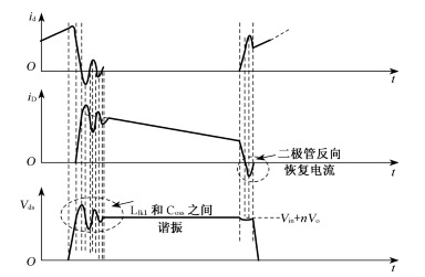 | 隨著世界范圍內對節能和環保的日益重視,使得電源行業對電源適配器的工作能效和待機損耗的要求不斷增加,本文以15W繼續式反激電源適配器為研究背景。設計一個完全能量傳遞反激式電源適配器 斷續模式的反激電源適配器設計,其技術指標如下: 輸入電壓:41~57VDC; 輸出電壓:17V; 輸出電流:0.8A; 額定效率:ηN≥80%; 開關頻率:f=82kHz。 斷續模式反激電源適配器電路設計 反激電源適配器電源適配器的電路原理圖如圖所示。主控芯片采用電流型控制芯片UC3843;輸入輸出電氣隔離;主控芯片UC3843與輸入為同一參考,這樣便于驅動、電流采樣和芯片的啟動;電壓誤差放大器與輸出為同一參考,誤差放大后的信號由光耦合器隔離傳回輸入側;芯片啟動以后供電由主電路的一個輔助繞組提供;變壓器原邊繞組加RCD吸收回路;輸出加LED指示燈。 ![]() 圖反激電源適配器電路原理圖 反激電源適配器RCD緩沖器的設計 圖是考慮寄生元件時反激式電源適配器的結構,這些寄生元件有:原邊和副邊的漏感Llk1和Llk2,MOSFET輸出電容Coss,二次側二極管結電容Cj。 ![]() 圖帶寄生元件的反激式電源適配器結構 工作于CCM和DCM下的id、iD和Vds的波形如圖12-3所示。當MOSFET關斷時,原邊電流(id)短時間內給MOSFET的Coss充電,當Coss兩端電壓Vds超過輸入電壓與反射電壓之和(Vin+nVo)時,二次側二極管導通,電感Lm兩端電壓鉗于nVo。Llk1和Coss之間會有高頻諧振和高的浪涌電壓,這個過高的電壓會作用于MOSFET,可能會引起MOSFET燒毀。 ![]() 在CCM下,二次側二極管保持導通直到MOSFET導通,當MOSFET導通時,二極管的反向恢復電流被加到原邊電路上,因此在MOSFET導通瞬間會在原邊電路里出現大的浪涌電流;在DCM情況下,一個開關周期結束以前,副邊電流已經降到0,Lm和MOSFET的Coss之間發生諧振。 Llk1與Coss諧振時會產生過高電壓,應該用緩沖電路來吸收這一電壓過沖,使開關管得到保護。 需要提醒讀者,反激電源適配器的優化設計是一個具有多個相互聯系的自變量的復雜數學模型,目前本文所闡述的優化設計方法也只是在假設一些變量固定的基礎上進行的,因此,本課題的優化設計結果并非較優結果。只是在一定的范圍內的較優化設計