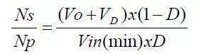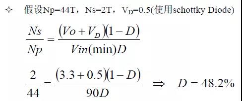 2)決定一次側濾波電容: 濾波電容的決定,可以決定電容器上的Vin(min),濾波電容越大,Vin(win)越高,可以做較大瓦數的Power,但相對價格亦較高。 3)決定變壓器線徑及線數: 當變壓器決定后,變壓器的Bobbin即可決定,依據Bobbin的槽寬,可決定變壓器的線徑及線數,亦可計算出線徑的電流密度,電流密度一般以6A/mm2為參考,電流密度對變壓器的設計而言,只能當做參考值,后面應以溫升記錄為準。 4)決定Duty cycle(工作周期): 由以下公式可決定Duty cycle ,Duty cycle的設計一般以50%為基準,Duty cycle若超過50%易導致振蕩的發生。