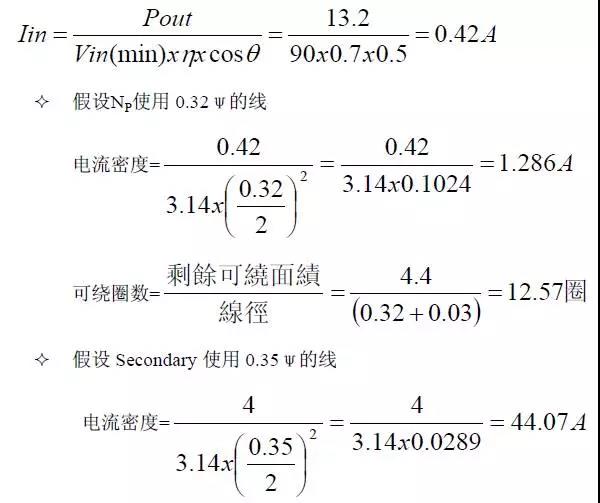 公式中,如此可得出B(max),若B(max)值太高或太低則參數必須重新調整。 變壓器計算: 輸出瓦數13.2W(3.3V/4A),Core = EI-28,可繞面積(槽寬)=10mm,Margin Tape = 2.8mm(每邊),剩余可繞面積=4.4mm。 計算式: 變壓器材質及尺寸:由以上假設可知材質為PC-40,尺寸=EI-28,Ae=0.86cm2,可繞面積(槽寬)=10mm,因Margin Tape使用2.8mm,所以剩余可繞面積為4.4mm。假設濾波電容使用47uF/400V,Vin(min)暫定90V。 8)決定變壓器的線徑及線數: