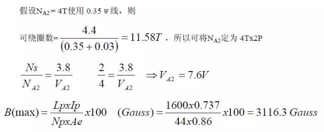 6)決定輔助電源適配器的圈數: 依據變壓器的圈比關系,可決定輔助電源適配器的圈數及電壓。 7)決定MOSFET及二次側二極管的Stress(應力): 依據變壓器的圈比關系,可以初步計算出變壓器的應力(Stress)是否符合選用零件的規格,計算時以輸入電壓264V(電容器上為380V)為基準。 注:若輸出電壓為5V以下,且必須使用TL431而非TL432時,須考慮多一組繞組提供Photo coupler及TL431使用。 將所得資料代入: