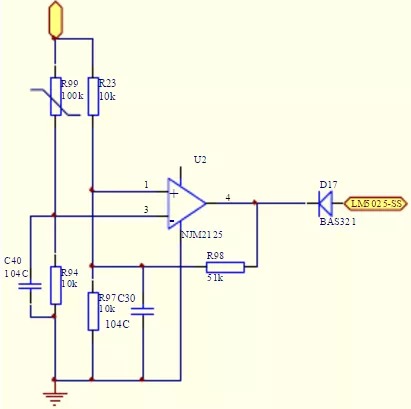 | 在電源適配器的集成電路芯片中,驅(qū)動器件等的功率消耗往往很大,電源適配器芯片中由于集成了高電壓和大電流的功率開關(guān)管,功耗會更大。功耗增大使芯片溫度升高,過高的溫度將導(dǎo)致半導(dǎo)體如初S管,三極管失效。當(dāng)芯片的工作溫度超過一定的溫度值后,芯片失效率成指數(shù)規(guī)律增加,并有可能使芯片燒毀。因此溫度是影響芯片穩(wěn)定性和可靠性的重要因素之一。為了保護(hù)芯片不受到永久性的損害,在芯片中集成過溫保護(hù)電路是非常有必要的。 什么是電源適配器過溫保護(hù)電路? 該電路屬于過溫保護(hù)電路,但溫度高于設(shè)定的保護(hù)點(diǎn)時,關(guān)閉模塊輸出,當(dāng)溫度恢復(fù)后自動開啟模塊。 電源適配器過溫保護(hù)電路組成原理圖 ![]() 電源適配器過溫保護(hù)電路工作原理分析(主要功能、性能指標(biāo)及實現(xiàn)原理): 穩(wěn)壓管給U103MAX6501提供5V電壓,溫度正常時,U103的五腳輸出高電平,當(dāng)溫度超過保護(hù)點(diǎn)時U103的五腳輸出低電平,當(dāng)溫度恢復(fù)后,U103的五腳輸出高電平。 4電路的優(yōu)缺點(diǎn) 該電路的優(yōu)點(diǎn):電路簡單,精確度高。 缺點(diǎn):成本較高。 5應(yīng)用的注意事項: 5.1 MAX6501的3腳和1腳相連時,回差溫度是10℃,當(dāng)其3腳和地相連時,回差溫度是2℃。 5.2 MAX6501的供電電壓不能超過7V,否則會損壞。 5.3 MAX6501一定要放置在較熱部分的附近。 過溫保護(hù)電路-熱敏電阻 1概述(電路類別、實現(xiàn)主要功能描述): 本電路采用熱敏電阻檢測基板溫度,熱敏電阻阻值隨基板溫度變化而變化, 熱敏電阻阻值的變化導(dǎo)致運(yùn)放輸入電壓變化,從而實現(xiàn)運(yùn)放的翻轉(zhuǎn)控制PWM芯片的輸出,進(jìn)而將模塊關(guān)閉。 2電路組成(原理圖): ![]() 3電源適配器過溫保護(hù)電路工作原理分析(主要功能、性能指標(biāo)及實現(xiàn)原理,關(guān)鍵參數(shù)計算分析): R99熱敏電阻是負(fù)溫度系數(shù)熱敏電阻,常溫時,R99=100k,R99與R94的分壓0.45V為U2運(yùn)放的負(fù)輸入,遠(yuǎn)低于運(yùn)放的正輸入2.5V(R23與R97分壓),因此運(yùn)放的輸出是高電平,對LM5025的SS端無影響,模塊正常工作。 隨著基板溫度升高,R99電阻阻值減小,當(dāng)減小到一定值時,使得運(yùn)放的負(fù)輸入大于正輸入時,運(yùn)放輸出低電平,將LM5025的SS拉低,從而關(guān)閉模塊輸出;溫度保護(hù)點(diǎn)可以適當(dāng)調(diào)整R94,R23,R97的阻值而相應(yīng)地調(diào)整。 模塊關(guān)閉輸出后(過溫保護(hù)),基板溫度會降低,R99阻值會增大,運(yùn)放的負(fù)輸入會降低,為使運(yùn)放的正常翻轉(zhuǎn),引入電阻R98,原理是運(yùn)放輸出低后,R98相當(dāng)于與R97并聯(lián),將運(yùn)放的基準(zhǔn)變低,拉開運(yùn)放正負(fù)輸入的電壓間距,從而實現(xiàn)溫度回差。比如基板溫度90℃時保護(hù),80℃時開啟。 4關(guān)鍵參數(shù)計算分析 4.1 運(yùn)放正輸入電壓:VR97=Vref2=5/(1+R23/R97)=5/(1+10/10)=2.5V 4.2 運(yùn)放負(fù)輸入電壓VR94+0.007=VR97=5*R94/(R99+R94)+0.007, 4.3 得出溫度保護(hù)時熱敏電阻的阻值:R99(t)=(Vref*R24/(Vref*R97/(R23+R97)-0.007))-R94 4.4 考慮容差時的計算見下表: 4.5 過溫保護(hù)時,R99的值 4.6 R99-SDNT2012X104J4250HT(F)是負(fù)溫度系數(shù)的熱敏電阻,25°C時100k,過溫保護(hù)時阻值10k左右(見上表),計算溫度為: Rt=R*e(B(1/T1-1/T2)) T1=1/(ln(Rt/R)/B+1/T2)) T2:常溫25°C,上式中T2=273.15+25=298.15;B:4250±3%;R:25°C時的電阻值,100k,計算出的T1值也是加了273.15后的值,因此下表中t1=T1-273.15,是攝氏度。Rt:溫度變化后的阻值,10k,9.704k,10.304k,見上表 4.7 回差 運(yùn)放輸出低后,電阻R98(51k)就并在R97上,將基準(zhǔn)拉低,新的基準(zhǔn)電壓 Vref1=Vref*(R98//R97)/(R23+R98//R97)=2.28V 達(dá)到2.44V時,R99的阻值R99=Vref*R94/Vref1-R94=11.9k R99達(dá)到10.49k時,溫度按下表計算 溫度回差=82.6-77.3=5.3℃ 5電路的優(yōu)缺點(diǎn) 優(yōu)點(diǎn): 溫度保護(hù)點(diǎn)及溫度回差很容進(jìn)行調(diào)整 缺點(diǎn): 溫度準(zhǔn)確度偏低 電路比采用溫度開關(guān)略復(fù)雜 溫度保護(hù)時反映的是熱敏電阻附近的基板溫度,不能反映模塊的較高器件的溫度,不過這可以在設(shè)計時解決,比如基板溫度在90℃保護(hù),實際板上器件較高溫度已達(dá)130℃,就可以適當(dāng)調(diào)整溫度保護(hù)點(diǎn),從而起到保護(hù)作用。 6電源適配器過溫保護(hù)電路應(yīng)用的注意事項 盡量將熱敏電阻放置在發(fā)熱器件附近。 所研究的電源適配器過溫保護(hù)電路不僅結(jié)構(gòu)簡單,工藝上容易實現(xiàn),而且抗干擾性能好。仿真結(jié)果表明,該電路很好實現(xiàn)了電源適配器過溫保護(hù)電路所要求的功能。