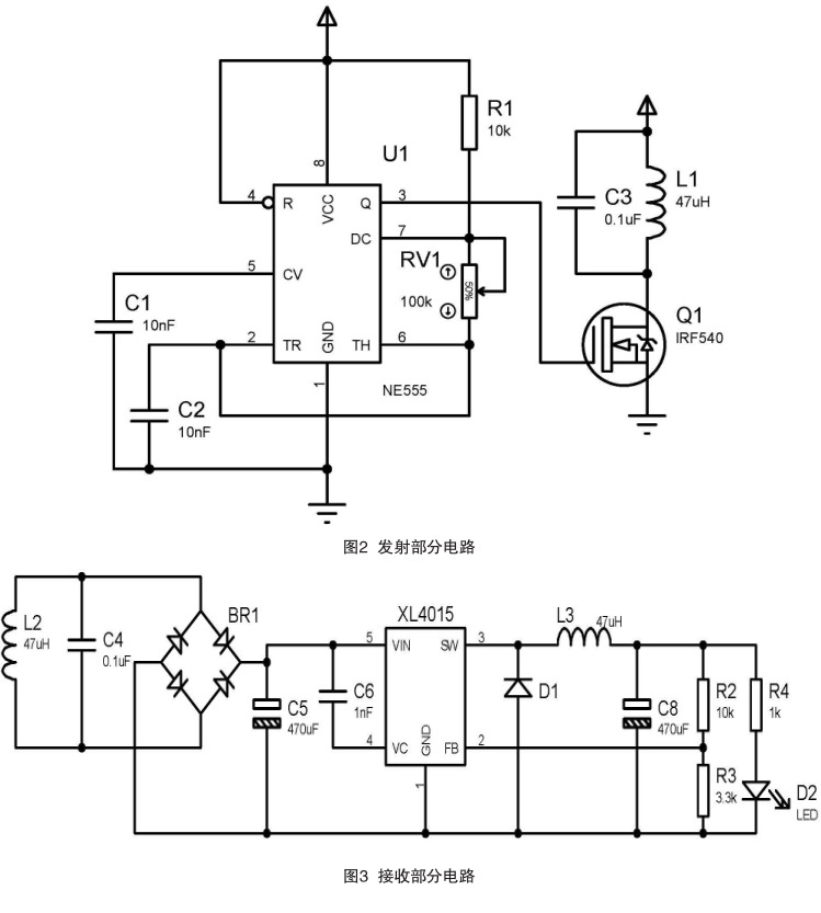 信號發生器電路設計 為了更好地給無線傳輸提供諧振源,信號發生器電路可以選用多種方式制作:DDS芯片、單片機信號、集成芯片NE555。系統選用電路結構較為簡單的NE555電路形成。NE555555定時器可使用于單穩態觸發器、無穩態觸發器、雙穩態觸發器。 本設計中,NE555工作在無穩態觸發器模式下,NE555的第1引腳(GND)接地,第2引腳(TRIG)接第6引腳(THR),第3引腳為信號輸出引腳,第4引腳(RST)接電源VCC,第5引腳(CTRL)通過1個瓷片電容接地,第7引腳(DIS)與第6引腳間接1個100kΩ可調電阻,第8引腳(VCC)接電源VCC。 驅動電路設計 驅動電路可選擇三極管或者MOS管做為驅動LC發送電路的元器件。三極管用電流控制型IC芯片,且耗損大,而MOS管屬于電壓控制型IC芯片,MOS管耗損較小,常用來電源開關,以及大電流地方開關電路。因此,系統采取MOS管進行驅動LC發送電路。 2.3LC發送與LC接收電路設計 為了促使LC發送電路與LC接收電路諧振頻率一致,發送和接收選用一致的電路,本系統選用電感L與電容C并聯的方式連接。結合各方面考慮,電感L電感量選擇47μH,電容C容量選擇0.1μF。發送和接收電容兩端電壓較高,電容選擇630V/104CBB電容。 整流濾波電路設計 整流電路可選擇半波整流或全波整流。半波整流電路結構比較簡單,只需一個二極管就可以整流,但交流電的正半周期有電流輸出,負半周期沒有電流輸出,這樣效率低;全波整流需4個二極管交替工作,整個周期都有電流輸出,這樣效率高。故本系統選用效率高的全波整流電路進行設計。此外,為了使整流后脈動的波形變得平滑穩定,整流后需增加濾波電容。 穩壓濾波電路設計 穩壓電路可采取線性穩壓電路或開關穩壓電路,線性穩壓電路的優點輸出電壓穩定、紋波小,但其轉換效率偏低。故本系統選擇效率較高的開關電源電路,選擇XL4015降壓型開關穩壓電路。 總體電路設計 依據上述分析并結合電路參數的選擇,發送部分電路如圖2所示,接收部分電路如圖3所示。