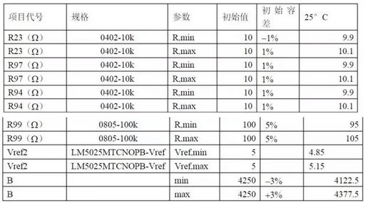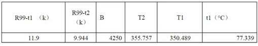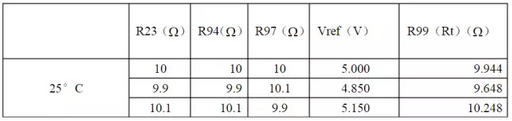 運放輸出低后,電阻R98(51k)就并在R97上,將基準拉低,新的基準電壓 Vref1=Vref*(R98//R97)/(R23+R98//R97)=2.28V 達到2.44V時,R99的阻值R99=Vref*R94/Vref1-R94=11.9k R99達到10.49k時,溫度按下表計算