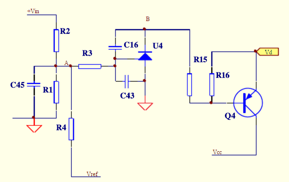 當電源輸入電壓高于欠壓保護設定點時,A點電壓高于U4的Vref,U4導通,B點電壓為低電平,Q4導通,Vcc供電正常;當輸入電壓低于保護電壓時,A點電壓低于U4的Vref,U4截止,B點電壓為高電平,Q4截止,從而Vcc沒有電壓,此時Vref也為低電平,當輸入電壓逐漸升高時,A點電壓也逐漸升高,當高于U4的Vref,模塊又正常工作。R4可以設定欠壓保護點的回差。