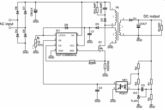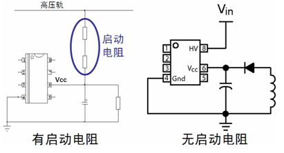 圖1帶啟動電阻與不帶啟動電阻(內(nèi)置電壓啟動電流源)對比。 降低輕載時的開關(guān)頻率,這系列控制器還采用輕載時頻率反走技術(shù)和跳周期模式。從而提升能效;同時,開關(guān)頻率在25kHz時鉗位,從而消除可聽噪聲。此外,這系列器件提供多種保護特性,如雙啟動電流電平、輸入欠壓及主電源過壓保護、過載保護、雙過渡維護閾值、軟啟動和閂鎖保護等。這系列器件還提供可選的動態(tài)自供電(DSS功能,從而無需輔助繞組;并內(nèi)置斜坡補償,不需要外部設(shè)定。以NCP1238為例,這器件的典型應(yīng)用電路圖如圖2所示。