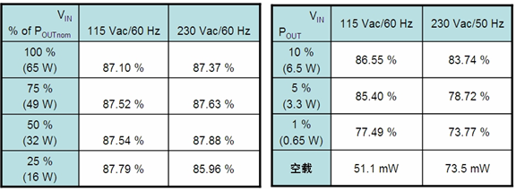 表2基于NCP123765W筆記本適配器工作能效及待機能耗測試結(jié)果。 這演示板在極輕載時也具有很高能效,需要指出的這能效測試結(jié)果是長度為1.05米、銅截面積為0.75平方毫米的直流線纜上所測得的更接近于真實中的能效測試結(jié)果。這演示板在115Vac時的平均能效高達87.32230Vac時平均能效也達87.21%均符合EPA 2.0工作模式的能效要求。從表2右側(cè)可以看出。且在空載(待機)模式下的能耗遠(yuǎn)優(yōu)EPA 2.0不高于0.5W規(guī)范要求。