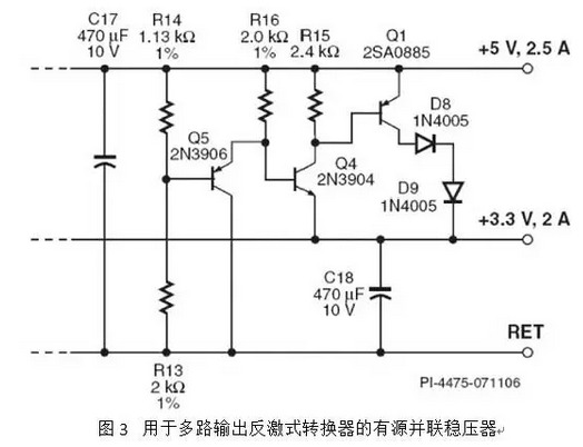 | 一、反激式電源中的鐵氧體磁放大器 對(duì)于兩個(gè)輸出端都提供實(shí)際功率(5 V 2 A 和 12 V 3 A,兩者都可實(shí)現(xiàn)± 5%調(diào)節(jié))的雙路輸出反激式電源來(lái)說(shuō),當(dāng)電壓達(dá)到 12 V 時(shí)會(huì)進(jìn)入零負(fù)載狀態(tài),而無(wú)法在 5%限度內(nèi)進(jìn)行調(diào)節(jié)。線性穩(wěn)壓器是一個(gè)可實(shí)行的解決方案,但由于價(jià)格昂貴且會(huì)降低效率,仍不是理想的解決方案。我們建議的解決方案是在 12 V 輸出端使用一個(gè)磁放大器,即便是反激式拓?fù)浣Y(jié)構(gòu)也可使用。 為了降低成本,建議使用鐵氧體磁放大器。然而,鐵氧體磁放大器的控制電路與傳統(tǒng)的矩形磁滯回線材料(高磁導(dǎo)率材料)的控制電路有所不用。鐵氧體的控制電路(D1 和 Q1)可吸收電流以便維持輸出端供電。該電路已經(jīng)過(guò)全面測(cè)試。變壓器繞組設(shè)計(jì)為 5 V 和 13 V 輸出。該電路在實(shí)現(xiàn) 12 V 輸出± 5%調(diào)節(jié)的同時(shí),甚至還可以達(dá)到低于 1 W 的輸入功率(5 V 300 mW和12V零負(fù)載) ![]() 二、使用現(xiàn)有的消弧電路提供過(guò)流保護(hù) 考慮一下 5 V 2 A 和 12 V 3 A 反激式電源。該電源的關(guān)鍵規(guī)范之一便是當(dāng) 12 V 輸出端達(dá)到空載或負(fù)載極輕時(shí),對(duì) 5 V 輸出端提供過(guò)功率保護(hù)(OPP)。這兩個(gè)輸出端都提出了± 5%的電壓調(diào)節(jié)要求。 對(duì)于通常的解決方案來(lái)說(shuō),使用檢測(cè)電阻會(huì)降低交叉穩(wěn)壓性能,并且保險(xiǎn)絲的價(jià)格也不菲。而現(xiàn)在已經(jīng)有了用于過(guò)壓保護(hù)(OVP)的消弧電路。該電路能夠同時(shí)滿(mǎn)足 OPP 和穩(wěn)壓要求,使用部分消弧電路即可實(shí)現(xiàn)該功能。 從圖 2 可以看出,R1 和 VR1 形成了一個(gè) 12 V 輸出端有源假負(fù)載,這樣可以在 12 V 輸出端輕載時(shí)實(shí)現(xiàn) 12 V 電壓調(diào)節(jié)。在 5 V 輸出端處于過(guò)載情況下時(shí),5 V 輸出端上的電壓將會(huì)下降。假負(fù)載會(huì)吸收大量電流。R1 上的電壓下降可用來(lái)檢測(cè)這一大量電流。Q1 導(dǎo)通并觸發(fā) OPP電路。 ![]() 三、有源并聯(lián)穩(wěn)壓器與假負(fù)載 在線電壓 AC 到低壓 DC 的開(kāi)關(guān)電源產(chǎn)品領(lǐng)域中,反激式是目前流行的拓?fù)浣Y(jié)構(gòu)。這其中的一個(gè)主要原因是其獨(dú)有的成本效益,只需向變壓器次級(jí)添加額外的繞組即可提供多路輸出電壓。 通常,反饋來(lái)自對(duì)輸出容差有嚴(yán)格要求的輸出端。然后,該輸出端會(huì)定義所有其它次級(jí)繞組的每伏圈數(shù)。由于漏感效應(yīng)的存在,輸出端不能始終獲得所需的輸出電壓交叉穩(wěn)壓,特別是在給定輸出端因其它輸出端滿(mǎn)載而可能無(wú)負(fù)載或負(fù)載極輕的情況下更是如此。 可以使用后級(jí)穩(wěn)壓器或假負(fù)載來(lái)防止輸出端電壓在此類(lèi)情況下升高。然而,由于后級(jí)穩(wěn)壓器或假負(fù)載會(huì)造成成本增加和效率降低,因而它們?nèi)狈ψ銐虻奈Γ貏e是在近年來(lái)對(duì)多種消費(fèi)類(lèi)應(yīng)用中的空載和/或待機(jī)輸入功耗的法規(guī)要求越來(lái)越嚴(yán)格的情況下,這一設(shè)計(jì)開(kāi)始受到冷落。圖 3中所示的有源并聯(lián)穩(wěn)壓器不僅可以解決穩(wěn)壓?jiǎn)栴},還能夠大限度地降低成本和效率影響。 ![]() 該電路的工作方式如下:兩個(gè)輸出端都處于穩(wěn)壓范圍時(shí),電阻分壓器 R14 和 R13 會(huì)偏置三極管 Q5,進(jìn)而使 Q4 和 Q1 保持在關(guān)斷狀態(tài)。在這樣的工作條件下,流經(jīng) Q5 的電流便充當(dāng) 5 V輸出端很小的假負(fù)載。 5 V 輸出端與 3.3 V 輸出端的標(biāo)準(zhǔn)差異為 1.7 V。當(dāng)負(fù)載要求從 3.3 V 輸出端獲得額外的電流,而從 5 V 輸出端輸出的負(fù)載電流并未等量增加時(shí),其輸出電壓與 3.3 V 輸出端的電壓相比將會(huì)升高。由于電壓差異約超過(guò) 100 mV,Q5 將偏置截止,從而導(dǎo)通 Q4 和 Q1 并允許電流從 5 V 輸出端流到 3.3 V 輸出端。該電流將降低 5 V 輸出端的電壓,進(jìn)而縮小兩個(gè)輸出端之間的電壓差異。 Q1 中的電流量由兩個(gè)輸出端的電壓差異決定。因此,該電路可以使兩個(gè)輸出端均保持穩(wěn)壓,而不受其負(fù)載的影響,即使在 3.3 V 輸出端滿(mǎn)載而 5 V 輸出端無(wú)負(fù)載這樣差的情況下,仍能保持穩(wěn)壓。設(shè)計(jì)中的 Q5 和 Q4 可以提供溫度補(bǔ)償,這是由于每個(gè)三極管中的 VBE 溫度變化都可以彼此抵消。二極管 D8 和 D9 不是必需的器件,但可用于降低 Q1 中的功率耗散,從而無(wú)需在設(shè)計(jì)添加散熱片。 該電路只對(duì)兩個(gè)電壓之間的相對(duì)差異作出反應(yīng),在滿(mǎn)載和輕負(fù)載條件下基本不起作用。由于并聯(lián)穩(wěn)壓器是從 5 V 輸出端連接到 3.3 V 輸出端,因此與接地的并聯(lián)穩(wěn)壓器相比,該電路的有源耗散可以降低 66%。其結(jié)果是在滿(mǎn)載時(shí)保持高效率,從輕負(fù)載到無(wú)負(fù)載的功耗保持較低水平。 四、采用 StackFET?的高壓輸入開(kāi)關(guān)電源 使用三相交流電進(jìn)行工作的工業(yè)設(shè)備常常需要一個(gè)可以為模擬和數(shù)字電路提供穩(wěn)定低壓直流電的輔助電源級(jí)。此類(lèi)應(yīng)用的范例