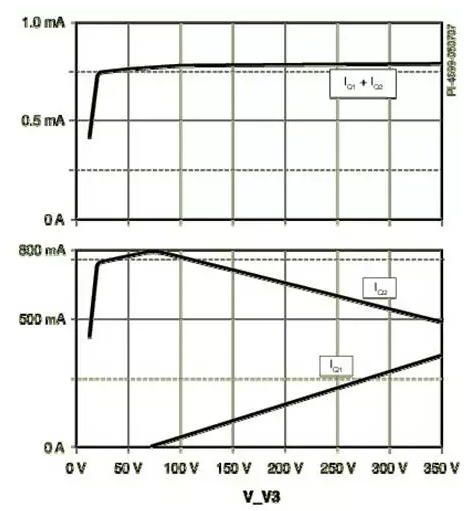 七、浮動(dòng)恒流源允許超寬范圍的輸入電壓 對(duì)Power Integrations的多數(shù)產(chǎn)品而言,數(shù)據(jù)手冊(cè)中限制的用于確保正常啟動(dòng)和起作用的小漏極電壓為50 V。但是,如果通過(guò)外部電源向旁路引腳饋電,則芯片可接收外部供電,且即使在較低的輸入電壓下也可啟動(dòng)和工作。 ![]() 圖8所示的啟動(dòng)電路為浮動(dòng)恒流源,它為整個(gè)輸入電壓范圍內(nèi)的 TinySwitch-III 的旁路(BP)引腳提供大約 600 μA 的恒流。恒流值由 R2 和 VR1 確定: ![]() 該電路源自基本的單晶體管電流源。該電路采用了一個(gè)齊納二極管,為 Q2 (NPN)的基極引出端設(shè)置參考電壓,并以此對(duì)流經(jīng)電阻 R2 的固定電壓進(jìn)行編程,從而設(shè)置恒流值。然而,鑒于輸入電源范圍的異常寬廣性,參考齊納二極管的偏置電流在很大范圍內(nèi)會(huì)有所差異。這將導(dǎo)致功率耗散增加及編程的恒流發(fā)生偏移。 要克服上述難題,需要由其他的電流源(由 Q1 (PNP)與 R1 形成)提供偏置電流。將等同于VBE 的恒壓強(qiáng)加于 R1,這樣可為整個(gè)工作范圍內(nèi)的參考齊納二極管提供偏置電流補(bǔ)償。 晶體管 Q2 以較低輸入電壓提供恒流,而 Q1 則以較高的輸入電壓提供恒流。圖 2 顯示了電流流經(jīng) Q1 和 Q2 時(shí)的模擬結(jié)果。輸入電壓達(dá)到大約 50 VDC 時(shí),Q2 將提供恒流。輸入電壓達(dá)到50 VDC 及以上時(shí),經(jīng)過(guò) Q2 的電流將減弱,而經(jīng)過(guò) Q1 的電流則呈線性增加。輸入電壓達(dá)到大值 375 VDC 時(shí),則主要由 Q1 提供恒流。R3 用于限制整個(gè)電路在輸入電壓大時(shí)的輸入電流。 ![]() 非線性電流由于齊納二極管 VR1 的非線性活動(dòng)而上升。輸入電壓大約為 60 VDC 時(shí),齊納二極管開(kāi)始有電壓。 八、用軟啟動(dòng)禁止低成本輸出來(lái)遏制電流尖峰 為滿(mǎn)足嚴(yán)格的待機(jī)功耗規(guī)范要求,一些多路輸出電源被設(shè)計(jì)為在待機(jī)信號(hào)為活動(dòng)狀態(tài)時(shí)斷開(kāi)輸出連接。通常情況下,通過(guò)關(guān)閉串聯(lián)旁路雙極晶體管(BJT)或 MOSFET 即可實(shí)現(xiàn)上述目的。對(duì)于低電流輸出,如果在設(shè)計(jì)電源變壓器時(shí)充分考慮到晶體管的額外壓降情況,則 BJT 可成為 MOSFET 的合適替代品,且成本更為低廉。 圖 1 0所示為簡(jiǎn)單的 BJT 串聯(lián)旁路開(kāi)關(guān),電壓為 12 V,輸出電流強(qiáng)度為 100 mA,并帶有一超大電容(CLOAD)。晶體管 Q1 為串聯(lián)旁路元件,由 Q2 根據(jù)待機(jī)信號(hào)的狀態(tài)來(lái)控制其開(kāi)關(guān)。電阻 R1 的值是額定的,這樣可確保 Q1 有足夠的基值電流在小 Beta 和大的輸出電流下以飽和的狀態(tài)工作。PI 建議額外添加一個(gè)電容器(Cnew),用以調(diào)節(jié)導(dǎo)通時(shí)的瞬態(tài)電流。如果不添加 Cnew,Q1 在導(dǎo)通后即迅速進(jìn)入電容性負(fù)載,并因而產(chǎn)生較大的電流尖峰。為調(diào)節(jié)該瞬態(tài)劍鋒,需要增加VT1的容量,這便導(dǎo)致了成本的增加。 用作 Q1 額外“密勒電容”的 Cnew 可以消除電流尖峰。該額外電容可限制 Q1 集電極的 dv/dt值。dv/dt 值越小,流入 Cload 的充電電流就越少。為 Cnew 指定電容值,使得 Q1 的理想輸出 dv/dt 值與 Cnew 值相乘等于流入 R1 的電流。