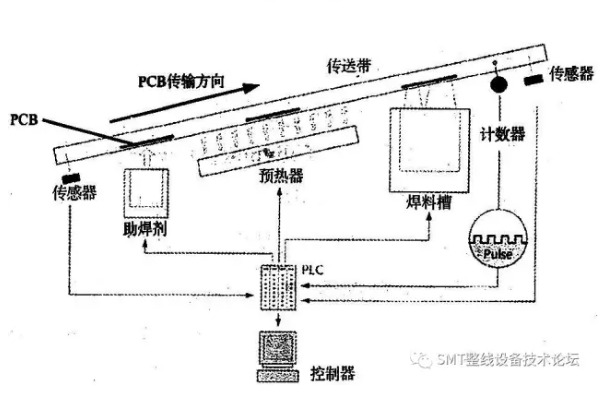 當(dāng)完成點(diǎn)膠(或印刷)、貼裝、膠固化、插裝通孔元器件的PCB線路板從波峰焊機(jī)的入口端隨傳送帶向前運(yùn)行,通過焊劑發(fā)泡(或噴霧)槽時(shí),印制板下表面的焊盤、所有元器件端頭和引腳表面被均勻地涂覆上一層薄薄的焊劑。