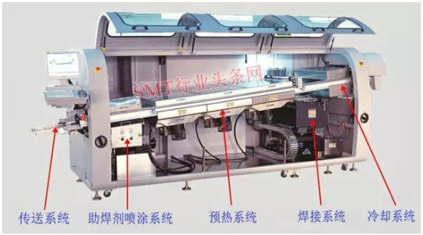 下面以雙波峰焊機(jī)的工藝流程為例,來說明波峰焊的工作原理 :