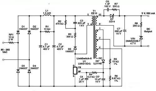 在電路中,二極管D1至 D4對AC輸入進行整流,電容C1和C2對DC進行濾波。L1、C1和C2組成一個π型濾波器,對差模傳導EMI噪聲進行衰減。這些與Power Integrations的變壓器E-sheild?技術相結合,使本設計能以充足的裕量輕松滿足EN55022 B級傳導EMI要求,且無需Y電容。防火、可熔、繞線式電阻RF1提供嚴重故障保護,并可限制啟動期間產生的浪涌電流。