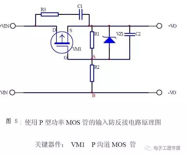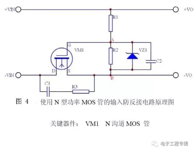 1、常情況下直流適配器輸入防反接保護電路是利用二極管的單向導電性來實現防反接保護。如下圖1示。 這種接法簡單可靠,但當輸入大電流的情況下功耗影響是非常大的。以輸入電流額定值達到2A,如選用Onsemi的快速恢復二極管 MUR3020PT,額定管壓降為0.7V,那么功耗至少也要達到:Pd=2A×0.7V=1.4W,這樣效率低,發熱量大,要加散熱器。 2、另外還可以用二極管橋對輸入做整流,這樣電路就永遠有正確的極性(圖2)。這些方案的缺點是,二極管上的壓降會消耗能量。輸入電流為2A時,圖1中的電路功耗為1.4W,圖2中電路的功耗為2.8W。 圖1,一只串聯二極管保護系統不受反向極性影響,二極管有0.7V的壓降 圖2 是一個橋式整流器,不論什么極性都可以正常工作,但是有兩個二極管導通,功耗是圖1的兩倍 MOS管型防反接保護電路 圖3利用了MOS管的開關特性,控制電路的導通和斷開來設計防反接保護電路,由于功率MOS管的內阻很小,現在 MOSFET Rds(on)已經能夠做到毫歐級,解決了現有采用二極管適配器防反接方案存在的壓降和功耗過大的問題。 極性反接保護將保護用場效應管與被保護電路串聯連接。保護用場效應管為PMOS場效應管或NMOS場效應管。若為PMOS,其柵極和源極分別連接被保護電路的接地端和適配器端,其漏極連接被保護電路中PMOS元件的襯底。若是NMOS,其柵極和源極分別連接被保護電路的適配器端和接地端,其漏極連接被保護電路中NMOS元件的襯底。一旦被保護電路的適配器極性反接,保護用場效應管會形成斷路,防止電流燒毀電路中的場效應管元件,保護整體電路。 具體N溝道MOS管防反接保護電路電路如圖3示: 圖3. NMOS管型防反接保護電路 N溝道MOS管通過S管腳和D管腳串接于適配器和負載之間,電阻R1為MOS管提供電壓偏置,利用MOS管的開關特性控制電路的導通和斷開,從而防止適配器反接給負載帶來損壞。正接時候,R1提供VGS電壓,MOS飽和導通。反接的時候MOS不能導通,所以起到防反接作用。功率MOS管的Rds(on)只有20mΩ實際損耗很小,2A的電流,功耗為(2×2)×0.02=0.08W根本不用外加散熱片。解決了現有采用二極管適配器防反接方案存在的壓降和功耗過大的問題。 VZ1為穩壓管防止柵源電壓過高擊穿mos管。NMOS管的導通電阻比PMOS的小,較好選NMOS。 NMOS管接在電源的負極,柵極高電平導通。 PMOS管接在電源的正極,柵極低電平導通。