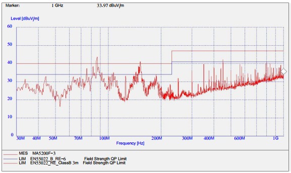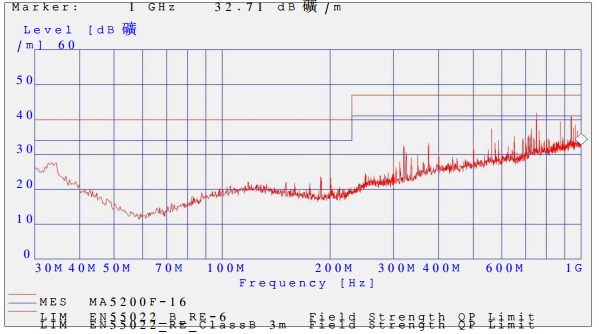 屏蔽插座與結(jié)構(gòu)搭接不良對(duì)屏蔽效能的影響 MA5200F 在進(jìn)行 RE 測(cè)試時(shí), 按照測(cè)試組網(wǎng)要求搭建環(huán)境, 機(jī)框前面板上連接各種業(yè)務(wù)線和調(diào)試用的控制線, 測(cè)試時(shí)發(fā)現(xiàn)輻射超標(biāo),在 70MHz~200MHz 之間輻射超標(biāo),超過限值線 4dB 左右,測(cè)試頻譜如下圖所示: