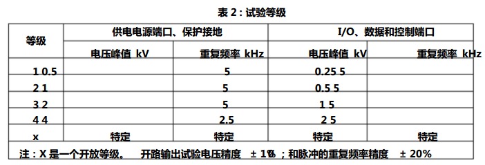 對交/直流電源端子的選擇耦合 /去耦網絡來施加快速瞬變脈沖群干擾信號。 對 I/O 信號、數(shù)據(jù)和控制端口選擇快速瞬變脈沖群測試專用的容性耦合夾來施加快速瞬變脈沖群干擾信號。 4.3.2.6 試驗等級及其選擇: 表 2:試驗等級