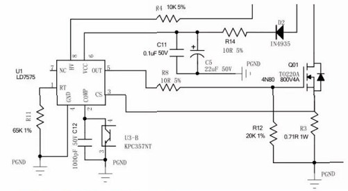 R11為lC工作頻率調(diào)整電阻, 02為輔助繞組供電整流二極管 R14為限流電阻, C5為低頻濾波電容, C11為高頻濾波電容, R3為過功電阻, R8為驅(qū)動電阻, R12 MOS開機保護電阻, C12為旁路電容, U3-B為光耦反饋端,
