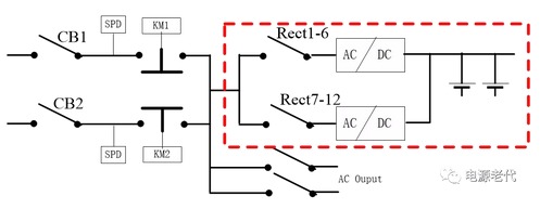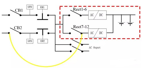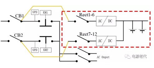 | 在處理完一次鐵路電源系統(tǒng)ATS故障后,曾向鐵路系統(tǒng)維護人員提出這樣一個優(yōu)化方案:電源適配器整流模塊全實時在線,更是大大提高系統(tǒng)可靠性! 改造前原系統(tǒng)方案如下: ![]() 圖5.1 電源適配器CC級ATS組成系統(tǒng)示意圖 圖5.1為艾默生網絡能源有限公司PS48600-3/2900-X4系統(tǒng)示意圖,可看出:電源適配器輸入兩路交流市電經CC級ATS后到交流母線,交流有幾個支路帶交流負載,其余主要是給直流系統(tǒng)用(如紅色框中部分); 直流系統(tǒng)是整個電源的核心,需要優(yōu)先保證其可靠性;而直流系統(tǒng)的交流輸入經與ATS串聯(lián)后,可靠性大大下降。 5.2 改造后系統(tǒng)方案如下: 5.2.1 兩路市電經原電源適配器系統(tǒng)主空氣開關CB1、CB2后仍接ATS; 5.2.2 艾默生防雷接在ATS前端,且每路市電配一個,所以防雷部分利舊; 5.2.3 原ATS輸出到整流模塊輸入空開匯流排的線&整流模塊輸入空開匯流排拆除; 5.2.4在ATS上端子或CB1輸出端子分別引輸入電纜,直接連到各整流模塊輸入空氣開關; 5.2.5 改造后,只要市電1、市電2任一路有電或都有電,直流母排始終有電,無任何切換,重要的部分可靠性大大提高! 改造后的系統(tǒng),因兩路完全在線,對電池要求可降低; 改造后,ATS觸點不走大電流,ATS自身故障率將降低,也提高交流負載供電可靠性! ![]() 圖5.2 改造后系統(tǒng)原理示意圖 電源適配器改造方案說明(只是說明工作量和原理) 圖5.3 改造示意圖 保證電源適配器模塊1-6和7-12位置均有相近數(shù)量的模塊;因兩路市電一路優(yōu)先,因此一般是市電一工作;斷開CB2及CB2上級空氣開關,斷開Rect7-12模塊輸入空氣開關(依據負載功率,可以是兩只或三只甚至更多),接圖5.3中黃線所示位置接線;接好線后繼續(xù)保持Rect7-12空氣開關斷開(改線的幾個都保持斷開); 電源適配器送CB2上級交流電、維持CB2、Rect2空開斷開狀態(tài):此時,不管ATS狀態(tài),只要交流2有電,負載就一直正常; 5.3.3 斷開CB1及上級空氣開關,接圖5.3.3綠色線示意,接模塊1-6電纜; ![]() 圖5.3.3電源適配器接線過程 在5.3.3電源適配器部分接線完成,合CB1及上級空開,此時模塊1—6工作將正常,此時系統(tǒng)結構將如5.3.4所示; 5.3.4 接線過程 5.3.5 將CB2及上級空開斷開,同理接Rect7-12模塊空開至CB2下端子線,接好后如圖5.3.5所示,送CB2及上級空開,模塊7-12將正常工作; 圖5.3.5 接線完成后 5.3.6 至此,改造順利完成; 文章轉載自網絡,如有侵權,請聯(lián)系刪除。 |