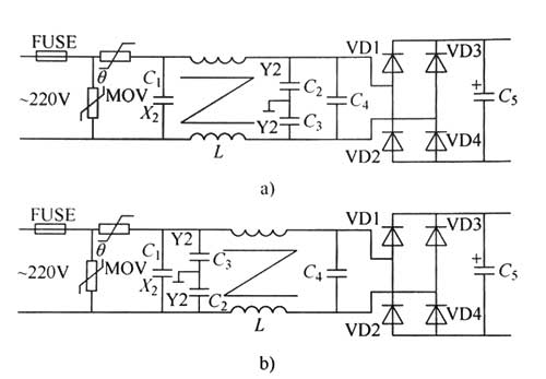 通常,限制上電浪涌電流的較簡單有效的方法是在整流器與濾波電容器之間或在整流器的輸入側加一負溫度系數熱敏電阻(NC),如圖4-2a所示,利用負溫度系數熱敏電阻的電前的常溫狀態下的較高阻值限制上電浪涌電流,上電后由于NC上流過電流并消耗電發熱使其電阻值降低以減小NTC上的損耗? 這種方法的特點是簡單,但存在的問題是限上電浪涌電流性能受環境溫度和NTC的初始溫度影響,因此在環境溫度較高或并機,在電時間間隔很短時NTC起不到限制上電浪涌電流的作用,因此這種限制上電浪涌電流方僅用于價格低廉的微機電源適配器或其他低成本電源適配器?而在一些彩色電視機和顯示器上,限制上浪涌電流則采用串一限流電阻,電路如圖4-2b所示,較常見的應用是彩色電視機,這種法的優點是簡單?可靠性高,允許在寬環境溫度范圍內,電視機在內部較高溫度可達60以上正常工作,其缺點是:限流電阻上有損耗,降低了電源適配器效率? 事實上整流器上電處于態工作后,這一限流電阻的限流作用已完成,僅起到消耗功率?發熱的負作用,因此在功較大的開關電源適配器中采用上電后經一個延時后用一個機械觸點或電子觸點將限流電阻短路路如圖4-2c所示,這種限制上電浪涌電流方式性能好?