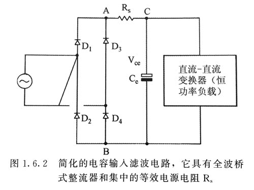 等效串聯(lián)電阻Rs 等效串聯(lián)電阻Rs,由所有串聯(lián)元件組成,包括出現(xiàn)于原邊供電充電器和儲能電容C5、C6之間的原邊充電器電阻。為了簡化分析,將各電阻集總為一個等效電阻Rs。為了進一步地減小峰值電流,可附加串聯(lián)電阻提供較合適的等效串聯(lián)電阻??梢钥吹秸麟娙葺斎霝V波器和儲能電路的性能在很大程度上取決于這種后面的較優(yōu)等效串聯(lián)電阻。 圖所示為橋電路的一種簡化形式。在此簡化電路中,串聯(lián)的儲能電容C5和C6由等效電容C來代替,并且等效串聯(lián)電阻R,被置于橋式整流器的輸出端來進一步簡化分析。 在圖所示的實例中,等效串聯(lián)電阻由以下部分組成。