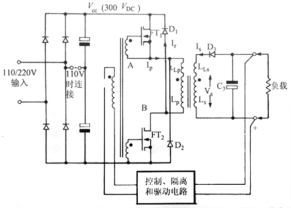 對角半橋正激變換器,別名雙晶體管正激變換器,它的原邊功率開關的接法類似于在反激變換器中的接法。圖表示了該功率系統的一般電路。 這種結構特別適合于場效應晶體管(MOSFET)的工作,因為能量恢復二極管D1和D2在開關元件上對充電器開關元件提供了強烈的鉗位作用,防止了反激作用時任何的過電壓。功率開關管兩端的電壓將不會超過充電器電壓加兩個二極管管壓降,因此電壓應力僅為單端變換器中單個晶體管所受應力的一半。 該例中已給出兩種輸入充電器電壓規格供選擇,通過撥動連桿LK1,用戶可選擇110V或220V作為輸入電壓。 110V工作時使用倍壓,因此無論是110V還是220V工作時,直流電壓V都接近于300V。高充電器無負載時的較大電壓將接近于380V,因此為保險起見,可以選擇額定電壓為400V的功率MOSFET(有些MOSFET高溫工作時電壓額定值下降,這一點應該考慮)。