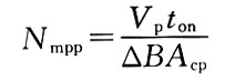 式中,Vp=原邊電壓Vcc/2,單位是V; ton=導通時間,單位是μs; △B=導通期間的總磁通密度變化(注意:△B=2B); Acp=較小磁心面積,單位是mm2; Nmpp=較小原邊匝數(推挽工作); B=磁通密度峰值(相對于零),單位是T。