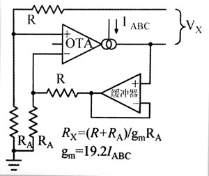 圖給出了VCR的具體工作原理?OTA的詳細工作原理請參考制造商的應用注釋∞)?注意等效電阻Rx的一端連接至OTA的輸出,Rx的電流等于Vx/Rx?Rx的另一端沒有直接引出,連至VCR的輸入,Rx的等效值是由受Vx影響的放大器偏置電流(1AC)設定的?OTA等效電阻(Rx)的公式為