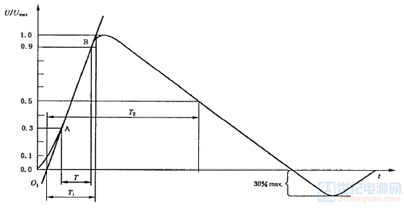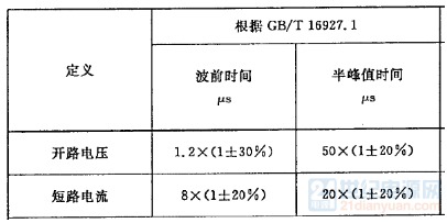 | 首先介紹一下什么是浪涌。浪涌一般是在開關瞬態(tài)或者雷電瞬態(tài)過程中產(chǎn)生的。 浪涌測試的官方叫法是“浪涌(沖擊)抗擾度實驗”; 測試標準參考IEC61000-4-5,或者GB/T 17626.5;該標準里面有詳細闡述了有關浪涌的知識。 我們在測電源適配器浪涌時,由浪涌發(fā)生器輸出的波形是一種組合波:1.2/50us電壓波(開路電壓)和8/20us電流波(短路電流),發(fā)生器的等效阻抗是2歐姆,用開路電壓峰值除以短路電流峰值就是該等效阻抗。具體波形參考下面兩圖: 1.2/50us開路電壓波,1.2us是波形的上升時間,具體指波形從10%上升到90%所用的時間,50us是半峰值時間,具體指波形上升至50%到波形下降至50%的時間,用示波器測量設備的開路波形就是這樣的。 ![]() 8/20us短路電流波,8us是波形的上升時間,20us是半峰值時間,具體定義同上,將設備的輸出端短路,測試短路電流就是這樣的波形。 ![]() 這幾個時間及開路電壓峰值、短路電流的誤差見下表: