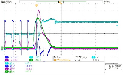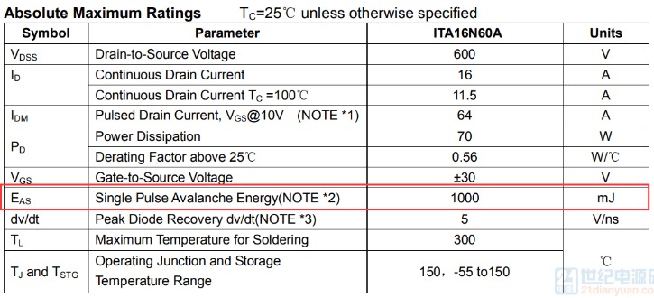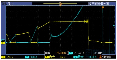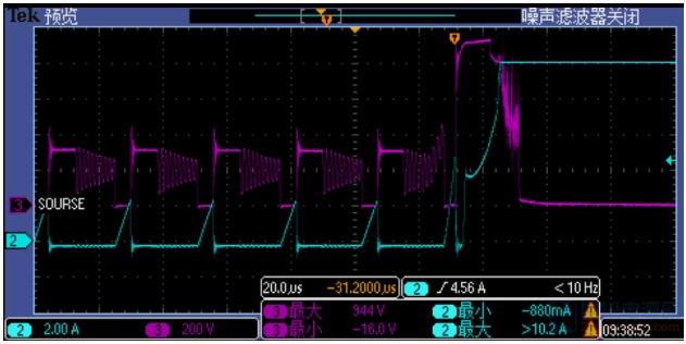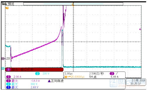 較后對比兩個設備的波形發(fā)現(xiàn),一個偏上限,一個偏下限,都沒有超出標準范圍。其實標準范圍大了,方便了造設備的。 今天剛給一個LED電源適配器打完4kV浪涌,附上4kV浪涌時,MOS管的波形,供參觀,下次再見: ![]() CH1-深藍色-VGS波形, CH2-淺藍色-VDS波形,較大816V, CH3-紫色-IDS波形,較大10.4A, CH4-綠色-L線電流波形,較大800A。 LED八字尾電源適配器-單級PFC結(jié)構(gòu),由于沒有大電解,在打浪涌時,浪涌能量很容易傳遞到功率MOS上。浪涌對MOS管的沖擊失效一般有兩種失效模式: 1-浪涌引起MOSFET 電流應力超過額定值,導致失效; 根據(jù)伏秒平衡定律,反激開關電源適配器變壓器電感: 公式1 ![]() 其中Von=Vin,D為占空比,r=0.3-0.5,fsw指開關頻率,IL是電感電流。Von一般較大277Vac或者300Vac,但是在浪涌脈沖測試時,由于母線電壓突然升高,超過設計輸入電壓較高值1.2倍或者更多,變壓器電感會迅速出現(xiàn)飽和。下圖1中紫色電流在開關周期后階段出現(xiàn)飽和跡象,MOSFET電流應力迅速上升達到7.32A。在正常開關周期,MOSFET IDS=3A。器件在高電流、高電壓應力發(fā)生雪崩,MOSFET失效,表現(xiàn)為短路,引起開關電源適配器輸入端保險絲,整流橋和驅(qū)動IC失效。 ![]() ![]() 圖1浪涌測試 紫色MOSFET IDS 黃色是VDS 圖2浪涌測試 紫色VDS電壓 ,藍色是IDS SJ-MOSFET 0.3Ω/700V 10A80E VD-MOSFET EAS=454mJ 2-浪涌引起MOSFET 電壓應力超過極限值,導致失效 開關電源適配器在浪涌測試時,由于前端浪涌吸收器件(壓敏電阻等)規(guī)格參數(shù)偏小導致母線電壓迅速爬升,進而導致MOSFET電壓應力迅速超過額定電壓1.1-1.2倍,MOSFET器件會迅速進入雪崩,IDS電流瞬間變大,導致器件功耗急劇增加,巨大的功耗轉(zhuǎn)換為溫升超過芯片極限溫度而引起失效。如圖2所示,60W 單級PFC LED電源適配器, 1.5KV 差模浪涌測試失效波形。結(jié)合圖3更準確說明此類問題,圖3所示黃色曲線電壓低于680V時,MOSFET處在關斷狀態(tài),IDS幾乎等于0;一旦超過680V,MOS管反向擊穿,電壓被嵌位,IDS電壓迅速爬升,后面器件由于熱量失控而導致失效。 ![]() ![]() 圖316N65A VD-MOSFET EAS=1000mJ 圖416N65A 規(guī)格書極限參數(shù) EAS=1000mJ 黃色線是MOSFETVDS電壓,藍色是IDS 浪涌失效瞬間,MOSFET短路,隨后繼續(xù)流過大電流,燒毀其他器件,尤其是采樣電阻較易燒壞,再燒斷保險司或者其他線路,使電源適配器與輸入斷開。 一般都是芯片被嚴重燒傷,見下圖。 ![]() 圖5 浪涌失效芯片外觀 圖6 浪涌失效芯片外觀