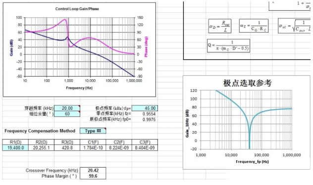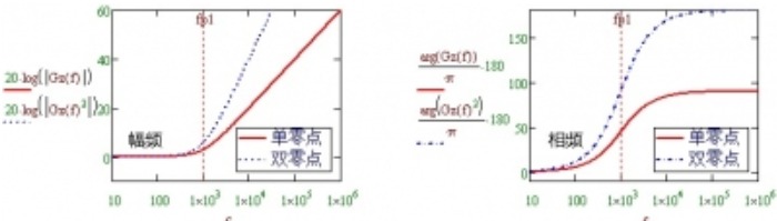 由于平板電腦電源適配器缺乏控制理論方面的知識(shí)在剛接觸反饋環(huán)路的時(shí)候?qū)ζ渲械暮芏嗝~不是很明白,這次準(zhǔn)備采用圖解的方法逐一的搞清楚這些名詞并且試圖找出一種便捷的設(shè)置零、極點(diǎn)的方法。大家可以分享。共同探討,進(jìn)步。![]() 在經(jīng)典控制理論中經(jīng)常看到PID控制(比例、積分、微分),這三者是獨(dú)立的互不影響的所以容易調(diào)節(jié)。零極點(diǎn)的方法同PID有異曲同工之妙,如果有被控系統(tǒng)的精確模型那么只要在bode圖上移動(dòng)零極點(diǎn)并采用加減運(yùn)算就能得出較理想的控制效果,貌似比PID還簡(jiǎn)單(PID的優(yōu)點(diǎn)是無(wú)需被控系統(tǒng)的模型)。如何理解零極點(diǎn)、雙重零極點(diǎn)、斜率-1過(guò)穿越頻率、條件穩(wěn)定、1/2fs采樣定理等等將是首先探討的問(wèn)題。 采樣頻率和被控對(duì)象的數(shù)學(xué)模型有什么必然的聯(lián)系?PID中的參數(shù)因相互獨(dú)立容易實(shí)現(xiàn)“盲調(diào)”,比如工程上不容易建模,被控對(duì)象又不復(fù)雜的,經(jīng)常會(huì)采用如下口訣 參數(shù)整定找較佳,從大到小順序查 先是比例后積分,較后再把微分加 曲線振蕩很頻繁,比例度盤要放大 曲線漂浮繞大灣,比例度盤往小扳 曲線偏離回復(fù)慢,積分時(shí)間往下降 曲線波動(dòng)周期長(zhǎng),積分時(shí)間再加長(zhǎng) 曲線振蕩頻率快,先把微分降下來(lái) 動(dòng)差大來(lái)波動(dòng)慢。微分時(shí)間應(yīng)加長(zhǎng) 理想曲線兩個(gè)波,前高后低4比1 一看二調(diào)多分析,調(diào)節(jié)質(zhì)量不會(huì)低 ![]() 圖1-1-1 單極點(diǎn)1—RC低通濾波器 單極點(diǎn)的特性如圖1-1-1所示可用一個(gè)RC低通濾波器來(lái)表述。隨著輸入信號(hào)頻率的增加輸出的電壓幅值不斷下降相位逐漸逼近-90度(相位滯后)。 符合這一特性的還有LR低通濾波器,見(jiàn)下圖: ![]() 圖1-1-2 單極點(diǎn)2—LR低通濾波器 從兩張圖可以看出極點(diǎn)的特性是使信號(hào)幅值發(fā)生衰減這對(duì)系統(tǒng)穩(wěn)定有益,不過(guò)相位滯后不利于系統(tǒng)穩(wěn)定。從bode圖上看極點(diǎn)就是使增益曲線發(fā)生順時(shí)針旋轉(zhuǎn)的拐點(diǎn),從公式上看就是能使分母等于零從而得到一個(gè)極大值(后面提到的原極點(diǎn)會(huì)比較明顯)。 如果將圖1-1-1和圖1-1-2串聯(lián)起來(lái)使用對(duì)幅值的衰減能力更強(qiáng),其幅頻特性和相頻特性曲線如下: ![]() 圖1-1-3中紅色曲線為單極點(diǎn)藍(lán)線虛線為兩個(gè)單極點(diǎn)串聯(lián),串聯(lián)后幅頻曲線由斜率-1變?yōu)榱诵甭?2,相位由-90度滯后為-180度,這就是雙極點(diǎn)的特性。 一般電路中的雙極點(diǎn)是由LC電路產(chǎn)生的,理想的不帶寄生電阻的LC雙極點(diǎn)圖如下: ![]() 在圖1-1-1中如果電容取無(wú)窮大(或RC無(wú)窮大)其極點(diǎn)頻率fp=1/(2πRC)將無(wú)限接近于零,變成了過(guò)零點(diǎn)的極點(diǎn)——零極點(diǎn)(或稱原極點(diǎn))。這時(shí)RC電路無(wú)限接近于積分電路,在實(shí)際補(bǔ)償環(huán)路中一般就是用積分電路來(lái)實(shí)現(xiàn)的零極點(diǎn)。 ![]() 從公式上看當(dāng)頻率f=0時(shí)分母等于零傳遞函數(shù)的增益無(wú)窮大,所以零極點(diǎn)可以用來(lái)提升靜態(tài)增益(零頻增益)。在補(bǔ)償環(huán)路中零極點(diǎn)一般是必須和首先增加的環(huán)節(jié)。 零點(diǎn)的特性剛好跟極點(diǎn)相反,對(duì)信號(hào)的幅值進(jìn)行放大同時(shí)相位產(chǎn)生+90度偏移(相位超前),前者不利于系統(tǒng)穩(wěn)定后者有益于系統(tǒng)穩(wěn)定。由于要對(duì)信號(hào)進(jìn)行放大所以單零點(diǎn)電路要借助于運(yùn)放來(lái)搭建。 ![]() 如圖1-2-1從bode圖上看零點(diǎn)就是增益曲線發(fā)生逆時(shí)針旋轉(zhuǎn)的拐點(diǎn),從公式上看零點(diǎn)在分子上可以使方程得到零值。 圖1-2-1中的電路兩個(gè)串聯(lián)就構(gòu)成了雙零點(diǎn)電路,幅頻特性和相頻特性曲線如下: ![]() 如果將圖1-1-1的單零點(diǎn)和圖1-2-1的單極點(diǎn)串聯(lián)起來(lái)使用結(jié)果會(huì)如何? ![]() 圖1-2-3 零點(diǎn)、極點(diǎn)重合 圖1-2-3顯示當(dāng)零、極點(diǎn)重合后輸出信號(hào)和輸入信號(hào)一致不發(fā)生任何改變。從這里可以得出一個(gè)結(jié)論:極點(diǎn)可用零點(diǎn)來(lái)補(bǔ)償零點(diǎn)可用極點(diǎn)來(lái)補(bǔ)償,雙極點(diǎn)可用雙零點(diǎn)來(lái)補(bǔ)償。