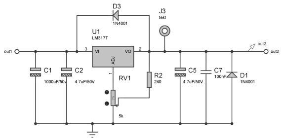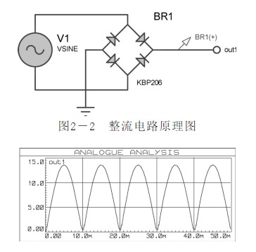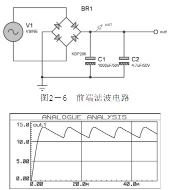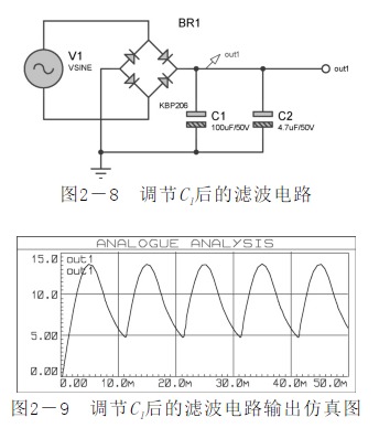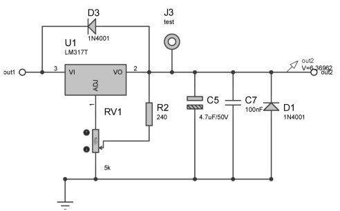 ![]() 為了驗(yàn)證濾波電容的效果,在原電路輸入基礎(chǔ)上將濾波電容C1改為100μF,輸入信號(hào)依然為15V、50Hz的交流信號(hào),設(shè)置方法如圖所示。利用軟件圖表功能仿真out1端輸出波形,如圖所示。 ![]() 如圖所示,濾波電路中電容大小直接影響電路的濾波效果。若將電容值設(shè)置過(guò)小,電路的濾波效果也會(huì)減弱。 綜上所述,輸入的交流信號(hào)經(jīng)整流電路整流,又經(jīng)濾波電路,后面將穩(wěn)定有效的電壓由out1端傳輸至穩(wěn)壓電路模塊??梢?jiàn),濾波電路在電路設(shè)計(jì)中是十分重要的。 3.穩(wěn)壓電路 使用三端穩(wěn)壓器有以下優(yōu)點(diǎn)。 (1)元件數(shù)量少。 (2)帶有限流電路,輸出短路時(shí)不會(huì)損壞元件。 (3)帶有熱擊穿功能。 三端穩(wěn)壓器選擇LM317(輸出電流為1.5A,輸出電壓可在1.25~37V之間連續(xù)調(diào)節(jié)),其輸出電壓由兩只外接電阻R2、RV1決定,輸出端和調(diào)整端之間的電壓差為1.25V。在輸出端同時(shí)并入二極管D1(型號(hào)為1N4001),當(dāng)三端穩(wěn)壓器未接入輸入電壓時(shí)可保護(hù)其不至于損壞。 閉路電視電源適配器信號(hào)由out1端輸入至三端穩(wěn)壓器,利用RV1控制輸出電壓大小,調(diào)節(jié)RV1電位器至位置1(2%)處,此時(shí)輸出電壓為2.12V,負(fù)載LED不點(diǎn)亮,電路仿真結(jié)果如圖2-10所示。 ![]() 三端穩(wěn)壓器較易損壞的是輸出腳(圖中2腳)電壓高于輸入腳(圖中3腳)而形成擊穿,因此一般像圖2-10中那樣并聯(lián)一個(gè)二極管1N4001,它的主要作用是:如果輸入端C1或C2出現(xiàn)短路,則輸出2腳會(huì)高于輸入3腳,很容易擊穿穩(wěn)壓器,所以反向并聯(lián)一個(gè)二極管,對(duì)1腳電壓進(jìn)行泄放,使2腳到3腳電壓限幅為0.7V,可有效保護(hù)穩(wěn)壓器不被反向擊穿。 用示波器監(jiān)視RV1處于位置1時(shí)穩(wěn)壓電路空載輸出端out2,結(jié)果如圖所示。 ![]() 調(diào)節(jié)RV1,使其到達(dá)位置2(16%),則穩(wěn)壓電路輸出端out2電壓也會(huì)增大。此時(shí)輸出電壓為6.37V,負(fù)載LED被點(diǎn)亮,如圖所示。 圖 RV1處于位置2時(shí)穩(wěn)壓電路仿真圖 用示波器監(jiān)視高擋位穩(wěn)壓電路輸出,結(jié)果如圖所示。 ![]() 在穩(wěn)壓輸出端out2處接入2kΩ電阻與LED負(fù)載進(jìn)行穩(wěn)壓測(cè)試,如圖所示。 加入2kΩ電阻與LED負(fù)載后,由穩(wěn)壓器輸出的直流電壓大小為6.37V,并可將LED點(diǎn)亮。用示波器監(jiān)視穩(wěn)壓電路輸出,結(jié)果如圖所示。 圖RV1處于位置2時(shí)穩(wěn)壓電路輸出仿真圖圖 穩(wěn)壓電路負(fù)載輸出仿真圖(一) 隨后在穩(wěn)壓器輸出端out2處加入5kΩ電阻與LED負(fù)載進(jìn)行測(cè)試,如圖所示。 圖穩(wěn)壓電路負(fù)載輸出仿真圖(二) 加入5kΩ電阻與LED負(fù)載后,由穩(wěn)壓器輸出的直流電壓大小為6.37V,并可將LED點(diǎn)亮。用示波器監(jiān)視穩(wěn)壓電路當(dāng)前輸出,結(jié)果如圖所示。 綜上所述,本項(xiàng)目所設(shè)計(jì)的可調(diào)式直流穩(wěn)壓電源適配器,能夠在負(fù)載變化的情況下提供穩(wěn)定可調(diào)的直流穩(wěn)壓電源適配器。 可調(diào)式單電源適配器直流穩(wěn)壓電路的整體電路原理圖如圖所示。 圖整體電路原理圖 經(jīng)過(guò)對(duì)電路板進(jìn)行實(shí)際測(cè)試,輸入15V交流電壓,輸出可以在1.48~14.84V之間可調(diào),基本符合設(shè)計(jì)要求。PCB版圖(見(jiàn)圖) 實(shí)物測(cè)試(見(jiàn)圖) 可調(diào)式單電源適配器直流穩(wěn)壓電路實(shí)物圖 為了提高電子設(shè)備的精度及穩(wěn)定性,在直流電源適配器中還要加入穩(wěn)壓電路,因此稱(chēng)為直流穩(wěn)壓電源適配器。典型的直流穩(wěn)壓電源適配器主要由電源適配器變壓器、整流電路、濾波電路和穩(wěn)壓電路等幾部分構(gòu)成。電源適配器變壓器把50Hz的交流電網(wǎng)電壓變成所需要的交流電壓;整流電路用來(lái)將交流電變換為單向脈動(dòng)直流電;濾波電路用來(lái)濾除整流后單向脈動(dòng)電流中的交流成分(即紋波電壓),使其成為平滑的直流電;穩(wěn)壓電路的作用是當(dāng)輸入交流電網(wǎng)電壓波動(dòng)、負(fù)載及溫度變化時(shí),維持輸出直流電壓的穩(wěn)定。本項(xiàng)目所介紹的可調(diào)式單電源適配器直流穩(wěn)壓電路在固定式單電源適配器直流穩(wěn)壓電路的基礎(chǔ)上,具有電壓可控、電壓穩(wěn)定度高等特點(diǎn),其輸出電壓精確可測(cè),可用于電源適配器精度要求比較高的設(shè)備或科研實(shí)驗(yàn)。