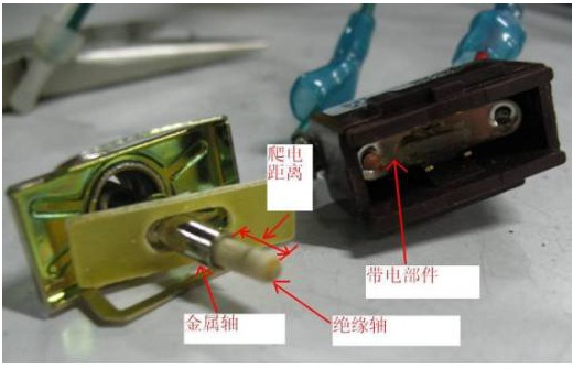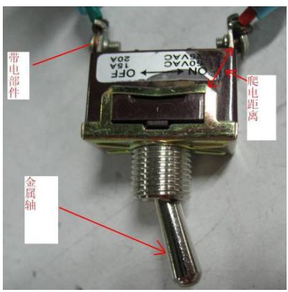 分析問題 根據(jù)GB4706.1第8.2條 “II類器具和II類結(jié)構(gòu),其結(jié)構(gòu)和外殼對與基本絕緣以及僅用基本絕緣與帶電部件隔開的金屬部件意外接觸應(yīng)有足夠的防護(hù)。只允許觸及到那些由雙重絕緣或由加強(qiáng)絕緣與帶電部件隔開的部件。” 因為該榨汁機(jī)為II類器具,所以該電源適配器開關(guān)的金屬軸如圖3所示,應(yīng)作為加強(qiáng)絕緣考慮。按照29.2.2的要求,金屬軸跟帶電部件之間的爬電距離應(yīng)大于8mm才符合要求。先不拆開電源開關(guān),從外部考核其爬電距離,如圖3所示,爬電距離大于8mm,似乎滿足標(biāo)準(zhǔn)要求。然后在金屬軸與帶電部件之間打3000V的耐壓,結(jié)果擊穿,分析原因后,估計是開關(guān)內(nèi)部的爬電距離不夠,所以就把電源適配器開關(guān)拆開,如圖4所示。分析其工作原理,開關(guān)內(nèi)部有一帶電金屬片,金屬軸通過絕緣軸與該金屬片接觸,扳動金屬軸,金屬片就會以翹板的形式實現(xiàn)接通和斷開。所以,金屬軸與帶電件之間較短的爬電距離應(yīng)為該絕緣軸的長度,如圖4所示。經(jīng)測量,該絕緣軸只有3mm左右,明顯不符合8mm的要求,所以該電源適配器開關(guān)的金屬軸應(yīng)視為可觸及的帶電部件,不符合標(biāo)準(zhǔn)第8.2條的要求。同時也不滿足GB4706.1的第22.34,22.35條“操作旋鈕、手柄、操縱桿和類似部件的軸不應(yīng)帶電…….”