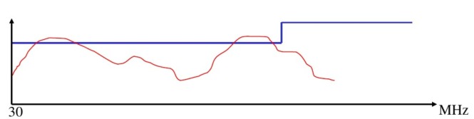 譜線問題描述: 30~300MHz頻段內出現寬帶噪聲超標, 如下圖: